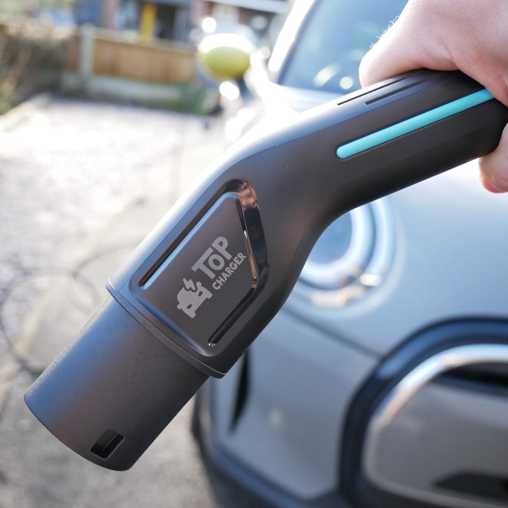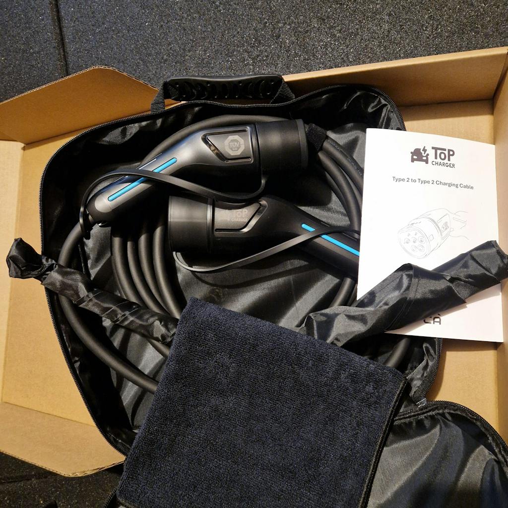 You'll find that the Top Charger type 2 cable is significantly nicer in feel and appearance than cables in and around this price point. It has the Top Charger logo on both heads, a satin finish, and a unique blue stripe.