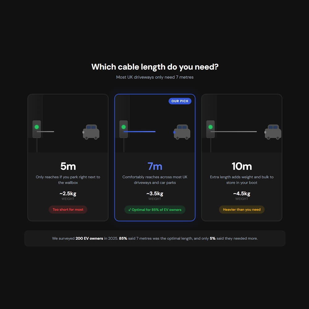 We surveyed 200 EV owners in 2025. 85% said that 7 metres was the optimal length for them, and only 5% said they needed more than that. Our 7m cable is 40% longer than a 5m cable, and 25% lighter than a 10m one, giving you the best lifestyle balance.
